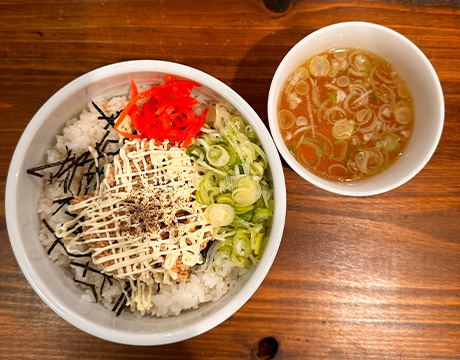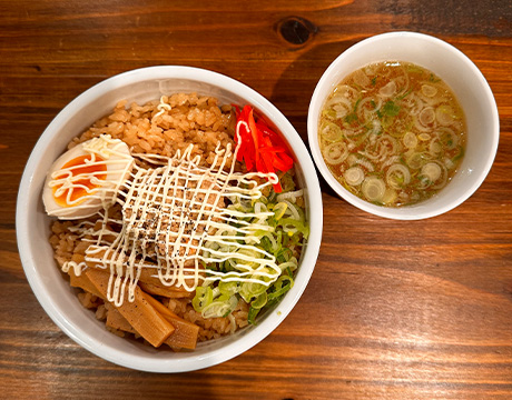夜はスタンダードのラーメンに濃厚豆乳麺も選べるお得なセット。ご飯は、とりめし、ミニつくねマヨ丼からお選び頂けます。